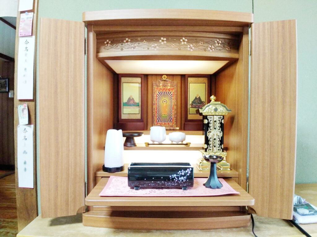 お父さま息子様ご夫婦と、ご家族でご来店いただきました。誠にありがとうございました。奥様がお好きだった桜並木を思い浮かべ、桜をモチーフにした家具調仏壇、仏具を選ばれました。桜が舞う様子に奥様のお姿が偲ばれることと思います。