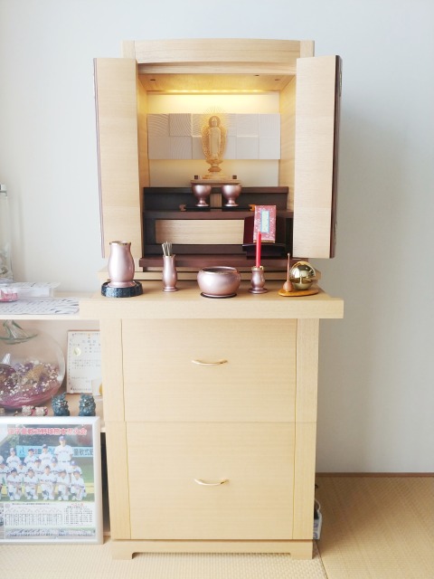 T様は「お母さんの供養をしたい」との息子さんのお気持ちを大切にされ、お仏壇をお迎えされる決心をされたそうです。「より身近な場所で家族の日常に寄り添えるように」とリビングに設置されました。朝夕、手を合わされてたくさんのお話をされるご様子が目に浮かびます。これからも佛壇の古屋鋪を、よろしくお願いいたします。