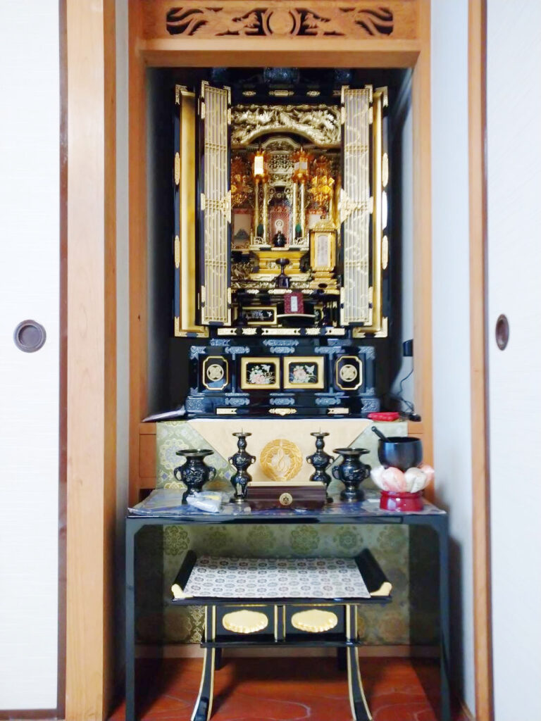 この度は大切なお仏壇の修復をお任せくださり、誠にありがとうございました。出来上がったお仏壇を見られ「納得の出来」と喜んでくださいました。またその後「お仏壇が綺麗になったので」と仏具一式も新調していただけました。ご宗派の正式なご荘厳をされたことで、お気持ちを新たに手を合わせていただけることと思います。今後ともどうぞよろしくお願いします。