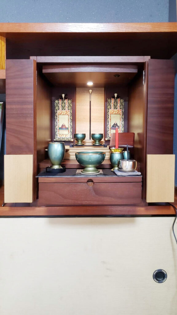 ご主人様のためのお仏壇を見にご来店くださいました。お子様と何度も相談され選ばれたお仏壇・仏具でした。仏間にお仏壇が入ったのをご覧になって、みな様安心されたご様子で私もホッといたしました。このご縁に感謝いたします。これからも末永いお付き合いを、よろしくお願いいたします。