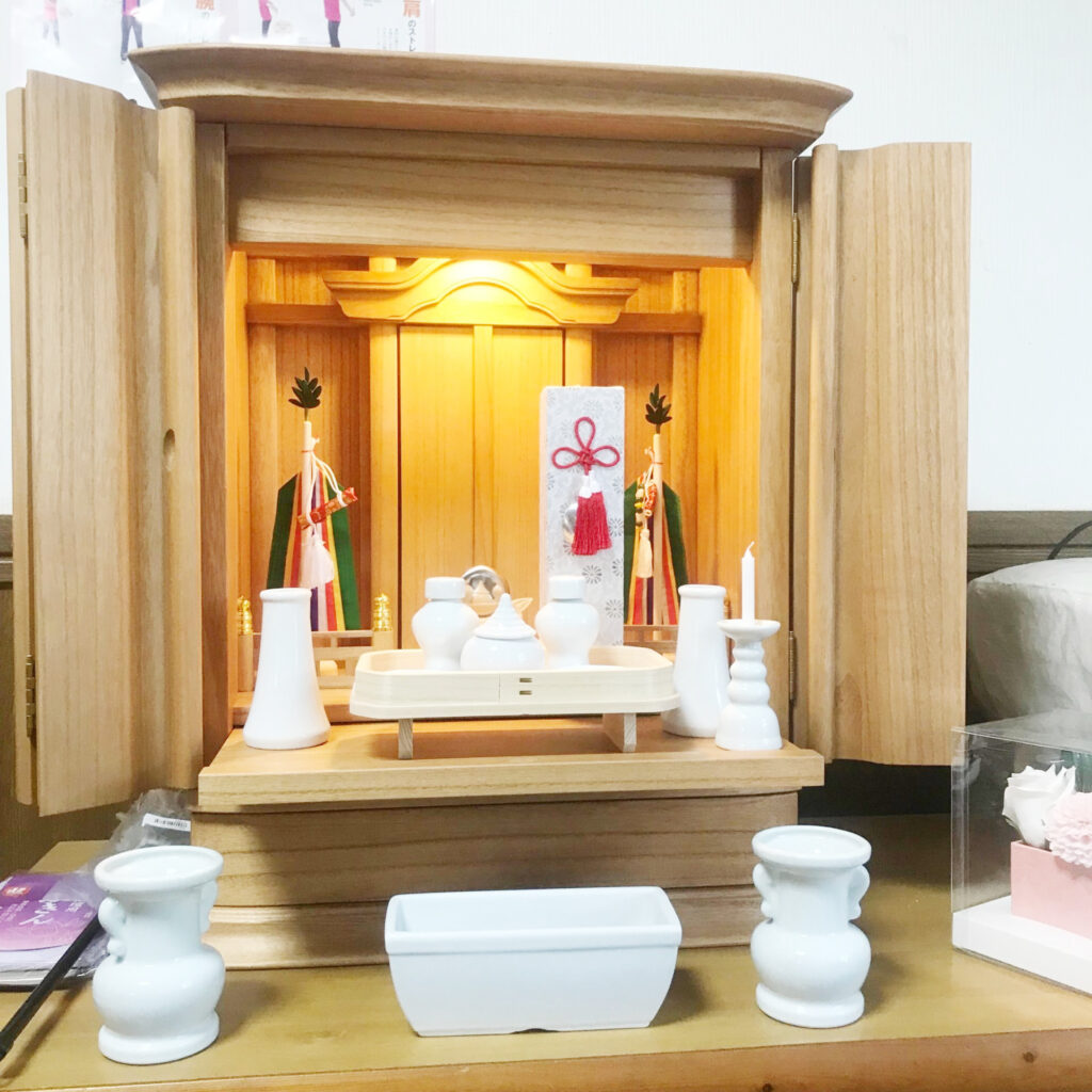 誰も住んでいらっしゃらないご実家に古い神道壇をお持ちだったN様。「だいぶ古いので新年を迎えるにあたり買い替えたい」とご来店くださいました。「神間はないので小形のものを」とのことでしたので家具調のコンパクトな神道壇をおすすめいたしました。気に入っていただけ嬉しく思います。