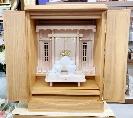 小形の神道壇を探して来店されました。明るい色の材質のものをご希望でしたので取り寄せて準備させていただきました。ご自宅のご神間も明るくなることと思います。これからも末永く、よろしくお願いいたします。