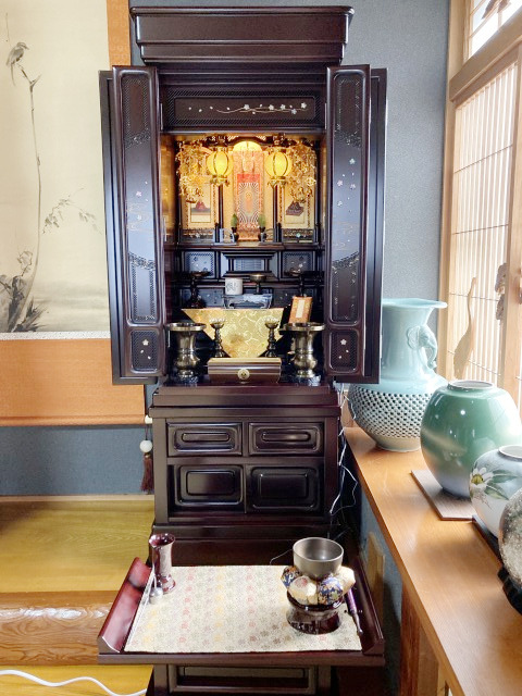 はじめは他社様のお仏壇を気に入っておられたそうですが、当店にご縁をいただきました。ありがとうございました。床の間に、お仏壇と床の間用掛軸を綺麗に納めることができ安心いたしました。これからも四季折々で奥様の素敵な心温まる手作り造花やお供え物でお仏壇のまわりを華やかにされてくださいね。