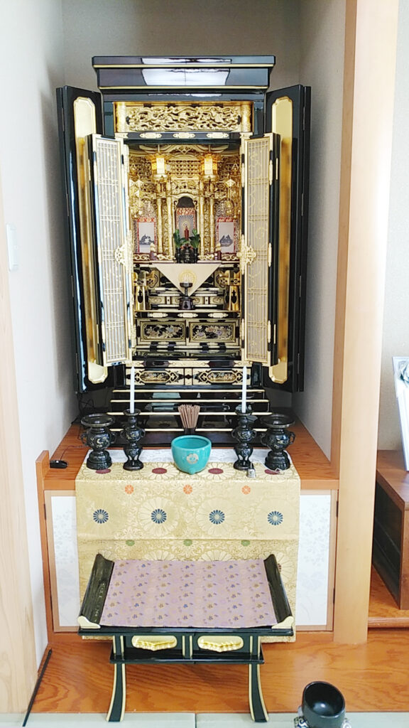M様はご主人のお母様を亡くされ、ご実家のお仏壇を修復するか新しくされるか迷っていらっしゃいました。今のお住まいの仏間に合う金仏壇を購入されました。仏間に綺麗に入り、たいへん喜んでいただけました。「初盆の事など色々と相談したい」と仰っていました。お盆近くになりましたら、ご相談ください。