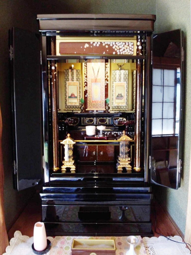 両家のお位牌を受け継がれることとなったA様ご夫妻。当店にたまたま通りがかりに立ち寄ってご縁をくださいました。金仏壇をご希望のご主人様とシンプルで可愛らしい仏壇を希望の奥様のどちらにも納得していただけるデザインです。日本を象徴する花とも呼ばれる桜を満開にし華やかに仕上げた塗りモダン仏壇となっております。