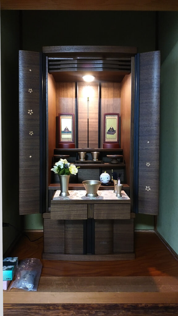 過去帳からご縁をいただきました。ありがとうございました。N様はご実家にはお仏壇をお持ちですが「自宅にはないので小さなものを」と話されました。せっかく仏間をお持ちでしたので少しでも高さのあるお仏壇が似合うと思いおススメさせていただきました。お部屋の雰囲気に合わせ色を選ばれました。たいへん喜んでいただけました。
