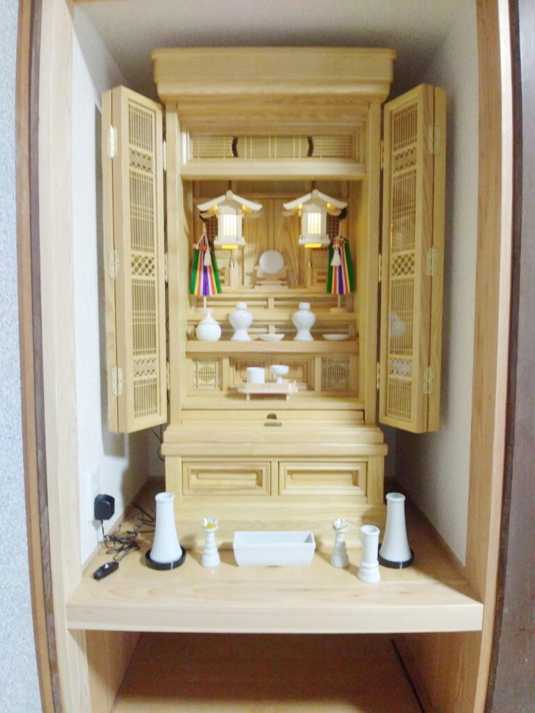この度は遠いところ足をお運びいただき、誠にありがとうございます。神道壇を決められてから神間を作られたのでピッタリと納まりました。慣れ親しんだ和室をイメージされた内装が故人様に安らぎあふれる空間を提供してくれます。子供さんやたくさんのお孫さん方が手を合わせていかれることでしょう。