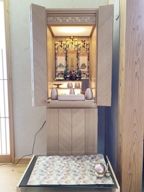 この度はご縁をいただき、誠にありがとうございます。ご来店の際、わたしどもの問いかけに、とても気持ち良くお答えくださいました。とてもありがたかったです。ご自宅のお仏壇を買い替えられました。ご自宅の雰囲気に合う家具調仏壇をお選びになりました。仏具は「正式なご荘厳である五具足が落ち着く」とのT様ご夫妻のご意見もあり、すべて準備させていただきました。今まで手を合わせてこられた掛軸も表装直しをして新品同様になりました。思いを受け継ぎながら今後も手を合わせていただければと思います。ありがとうございました。