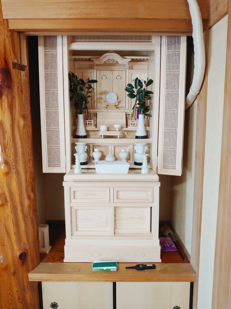 この度は「佛壇の古屋鋪 鹿屋店」とのご縁をいただき、誠にありがとうございました。お父様とご長男様のおふたりで来店されました。いろいろ迷われましたが最後はお父様が気に入られた神道壇に決められました。本当に感謝申し上げます。これからも何かご用がございましたら、いつでもお尋ねください。