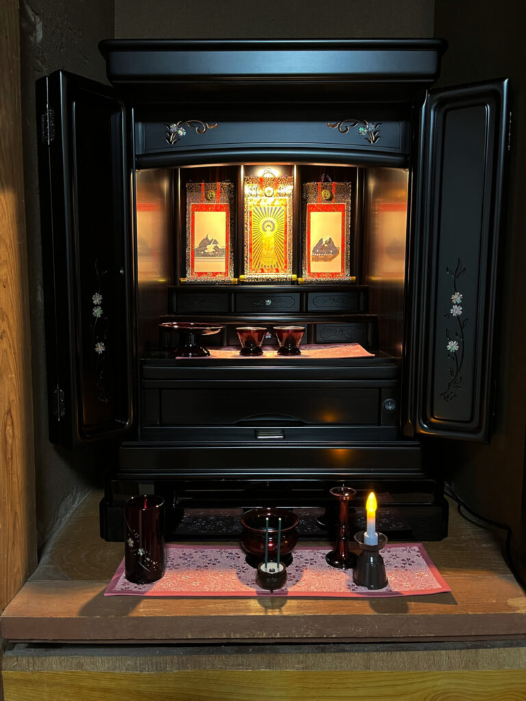 ご家族で来店されました。「仏間の幅があまりないので」と小型の仏壇をお探しでした。サイズ的にちょうど良い家具調仏壇をご契約いただけました。花柄のワンポイントも素敵で、毎日のお勤めが楽しくできることと思います。ご縁をいただき、ありがとうございました。