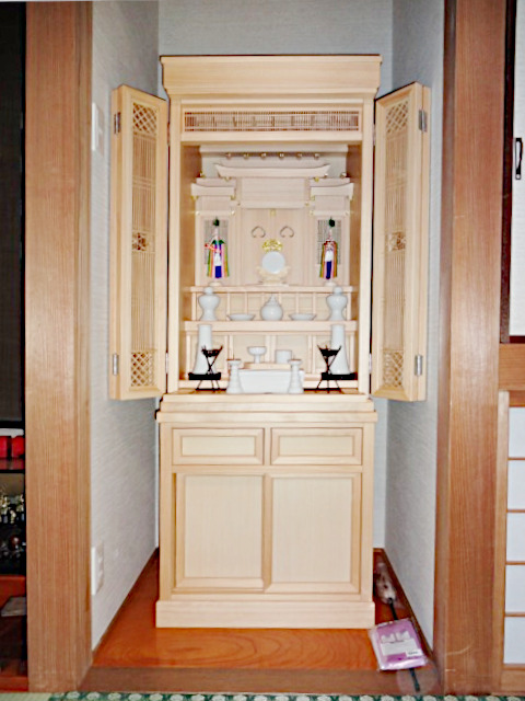 ご夫婦で来店されました。「自分たちで位牌を見ることになったので神棚がほしい」と話されました。いろいろ見ていただいた中から桧のものを気に入られました。「サイズもちょうど良い」とご購入くださいました。これからもよろしくお願いします。