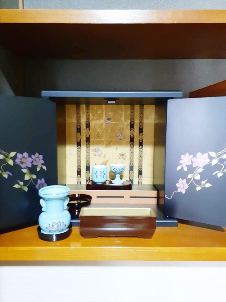本日はご購入いただき、ありがとうございました。「できるだけ小形の仏壇が欲しい」と来店されました。女性でも持ち運びができ鉄仙の色合いが華やかな塗モダン仏壇です。お部屋の雰囲気にも合うミニ仏壇だと思います。
