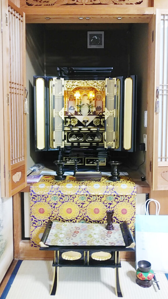 お寺の係をしていらっしゃるY様。「自宅に仏壇を入れてなかったので」と来店されました。仏間に換気扇をつけられ準備万端でした。全てを仏間に納められるサイズをご希望でしたので小さめのお仏壇を選ばれました。「良かった良かった」と喜んでいただけました。この度はご縁をありがとうございました。