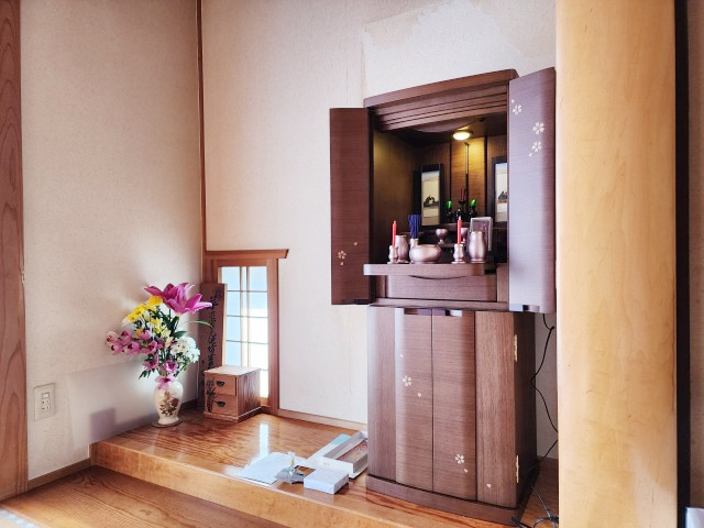 お仏壇の買い替え、誠にありがとうございました。当店に念珠を買いに来てくださったことがご縁となりました。ご実家も当店にてお仏壇をご購入くださったそうです。お飾りは浄土真宗に倣って、しっかりと揃えられました。ぜひ大切に使ってくださいませ。またのお越しをお待ちしております。
