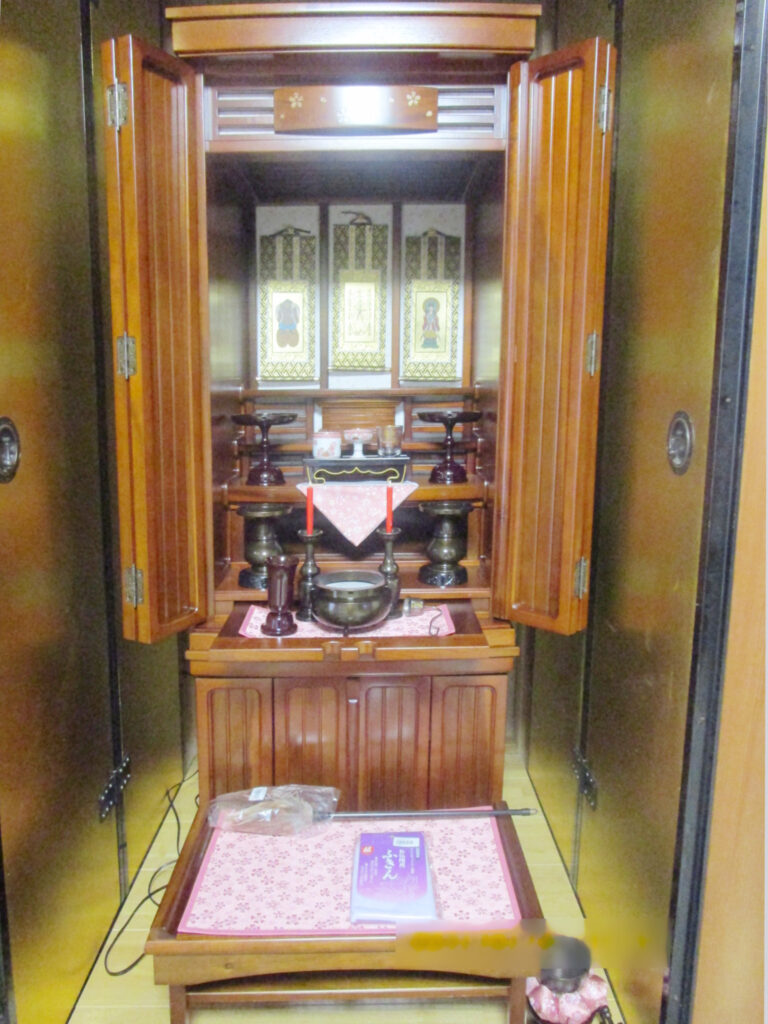 同窓会で久しぶりに顔を合わせ仏壇の話を聞かれました。一週間後にご夫婦で来店。いろいろと悩みながら見てまわられました。最終的に私どもがおすすめした唐木仏壇に決められました。小物はピンクで統一されました。喜んでいただけ嬉しく思います。ご夫婦共同作業で工事をされた仏間にピッタリでした。Yちゃん、ありがとうございました。