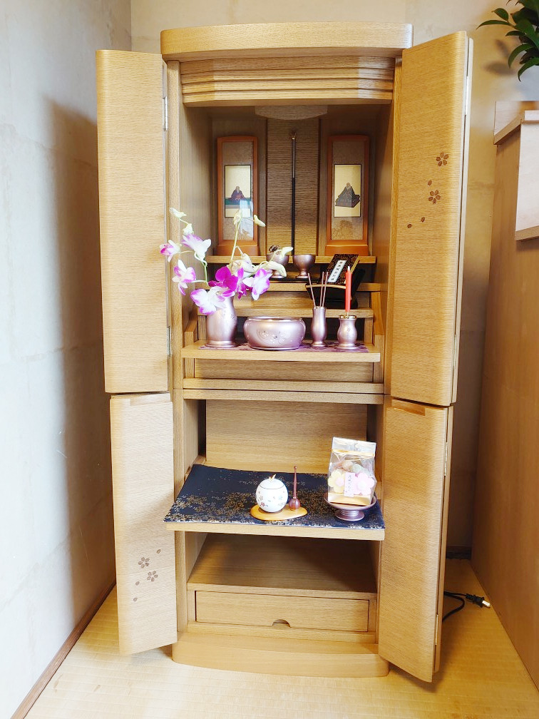 お姉さまとお嫁さまと見に来てくださいました。家具調仏壇を選んでくださいました。まことにありがとうございます。古いお仏壇から買い替えられました。お気持ちも変わられるのではないでしょうか。これからもお近くにこられた際は、お店にもお立ち寄りください。スタッフ一同お待ちしております。