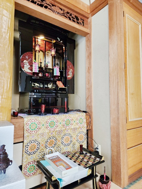この度はお父様のご逝去謹んでお悔やみ申し上げます。ご実家にお持ちのお仏壇を「自宅へ持ってこれないか」とのご相談をいただきお伺いいたしましたが、仏間サイズとの関係で大きな調整が必要となりましたので、ベストな選択として今回は買い替えを薦めさせていただきました。川辺工場の技術が詰まった逸品です。大切にお使いください。