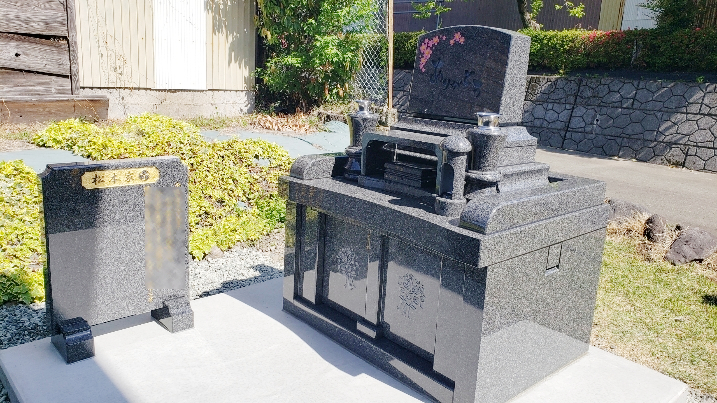 この度は墓石新規建立ありがとうございました。以前お仏壇でご縁がありました。今回は「せっかくなら」と墓石建立を決めてくださいました。「自宅敷地内にたてたい」とのご要望でした。モダンな造りのご自宅に合うタイプのお墓をご提案させていただきました。ワンポイントでお花を彫刻するようにしました。何回も何回もM様と打ち合わせを重ね、やっとイメージ通りの図面ができあがりました。完成したお墓をごらんになって、お父様もたいへん喜んでいらっしゃいました。ほんとうによかったです。これからもよろしくおねがいいたします。 合掌
