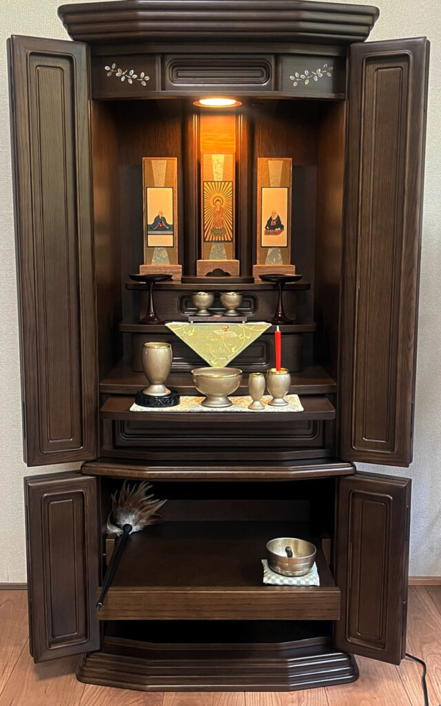 お母様供養のために事前にいろいろ勉強をされご来店くださいました。「安置場所にピッタリだ」と家具調仏壇を選ばれました。仏具もひとつひとつ意味合いを確認されながら、ていねいに決めていかれました。華鋲やヨーラクなどは追々購入されるご予定です。「正式な荘厳にしたい」との事でいろいろとご相談をいただいております。お役に立てますよう頑張ってまいりますので、末永いお付き合いをよろしくお願いいたします。