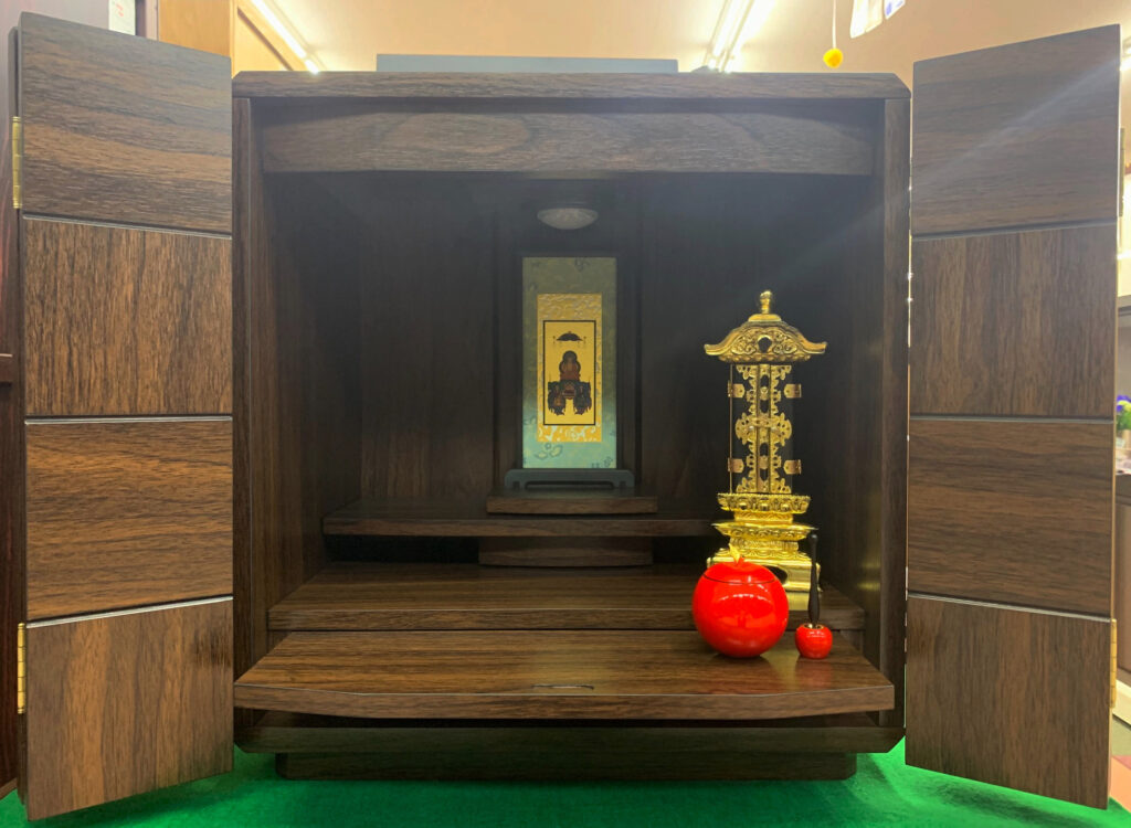 「小さいお仏壇を探している」と娘さんと一緒に来店されました。家具調仏壇の現品がなく写真をお見せしたところ気に入っていただけました。入荷時再来店され、かわいらしいリンとお位牌をセットで購入されました。リンゴの形をしたリンを見るたびに、ご主人のことを思いだされ手を合わせることと思います。この度はご縁をいただき、ありがとうございました。