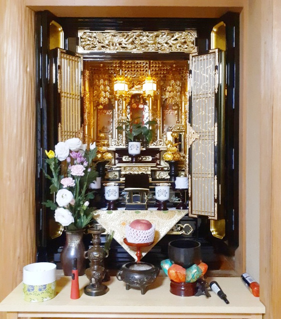 灯篭の修理がきっかけで仏壇塗替えの説明をさせていただきました。心良くお任せくださいました。ありがとうございます。仕上がりの綺麗さに、たいへん喜んでいらっしゃいました。私どもも嬉しく思いました。今後とも、古屋鋪をよろしくお願いいたします。