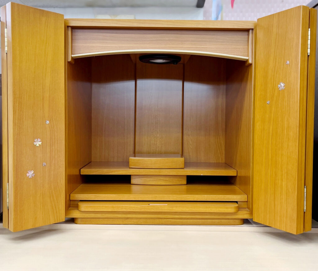 「古いお仏壇はあるのですが、新しく買い換えたい」と来店されました。お仏壇を置く場所を悩まれており、下台つきのお仏壇や小型仏壇など、いろいろご覧になられました。上置の家具調仏壇に決められました。大戸の花柄が素敵ですので毎日のお務めも楽しくできることと思います。ご縁をいただきありがとうございました。