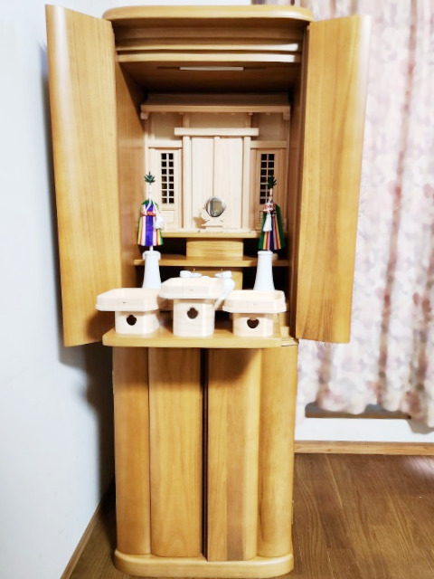 最初は娘さんが来店されました。いろいろと見られ「父に見てもらうので」と写真を撮って帰られました。次にお父様と来店され家具調神道壇に決められました。お父様思いの娘さんでした。お父様の安心したお顔を見てホッとされている様子でした。この度はご縁をありがとうございました。