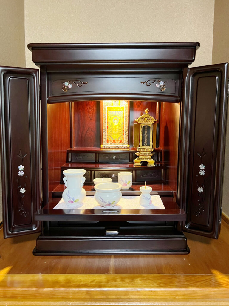 ご夫婦で来店されました。小型のお仏壇をお探しでした。何度も足を運んでくださり家具調仏壇を選ばれました。遠方からのご来店、まことにありがとうございました。