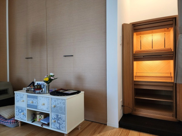 当店へご縁をいただき、誠にありがとうございました。鹿屋のご実家の仏壇処分およびご自宅の家具調仏壇の検討をされていました。ご本尊並びに脇侍は表装を仕立て直し、新しいお仏壇へ安置いたします。今まで通りお参りいただけると思いますので、完成までしばらくお待ちください。今後ともよろしくお願いいたします。