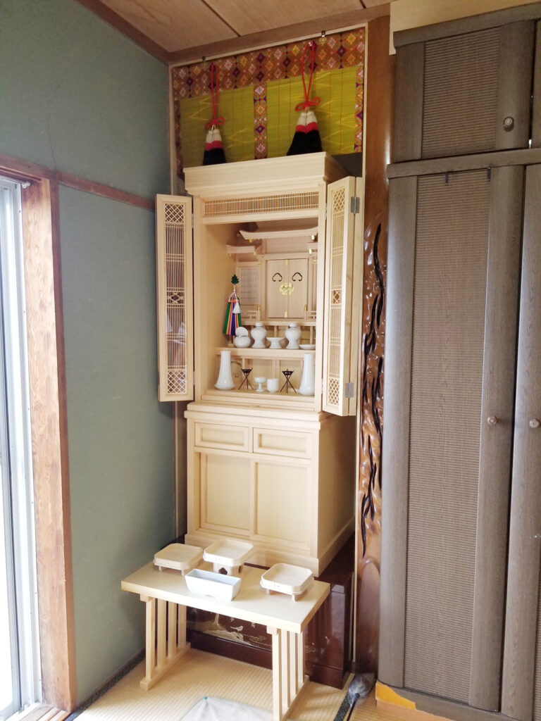 数ある中から弊社をお選びいただき、誠にありがとうございます。こちらの説明にご納得いただき、桧材の神道壇をお選びいただきました。本格的な竹簾や、高さを調整するための特注台も作成させていただきました。神道壇が非常に引き立ちました。これからも末永くよろしくお願い申し上げます。