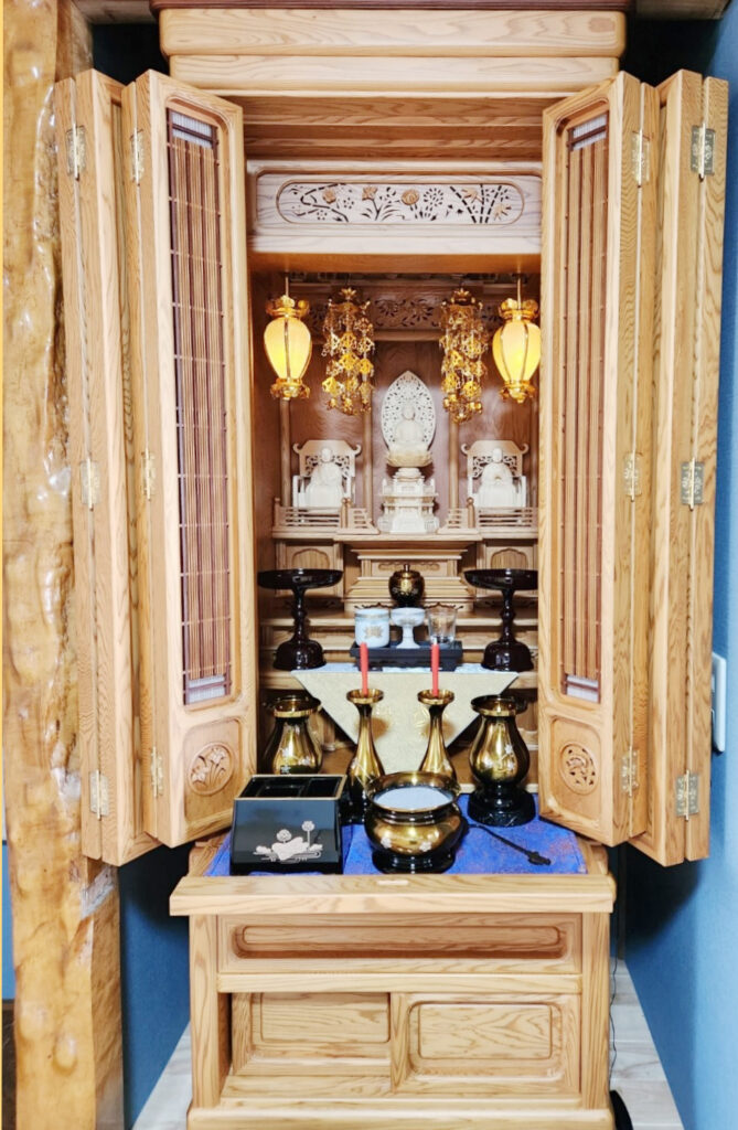 ご夫婦でご来店され、仏壇をご覧になりました。買い替えを希望されており、唐木仏壇をご覧になっていました。当初は紫檀色の仏壇をご覧になっていましたが、屋久杉のお仏壇に目が留まり、ご案内させていただきました。「自宅の仏間を見てほしい」と言われたので訪問し、採寸したところ仏間の改造の余地がありました。全ての寸法を測り、説明させていただきました。「仏壇が入れば仏具等はお任せする」ということで、今回、仏壇(18×51)と仏具(桜金彫)をご契約いただきました。立派な仏壇と古屋鋪のオリジナル仏具に大変満足されていました。ご縁と高いご評価をいただき、誠にありがとうございました。