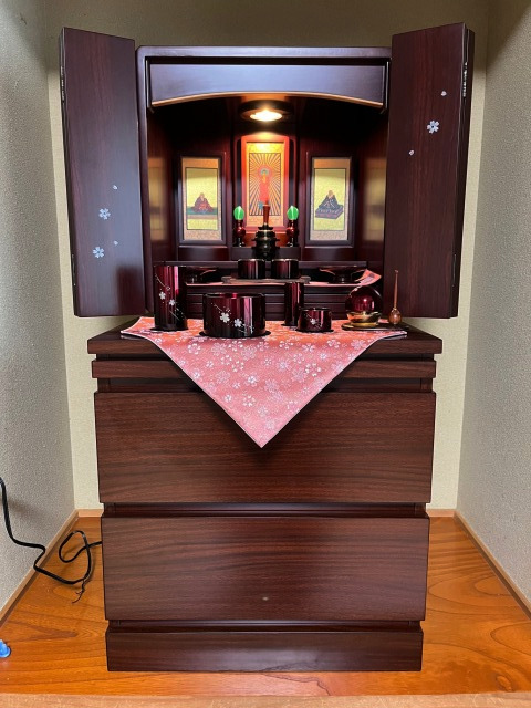ご夫婦でご来店されました。「お道具を高い所に置きたい」とのご希望がありましたので、小型仏壇と下台をおすすめさせていただきました。下台・お仏具も色を合わせられました。毎日のお務めが楽しくできることと思います。10年保証がついておりますので、何かございましたらいつでもお気軽にご連絡ください。ご縁をいただき、ありがとうございました。