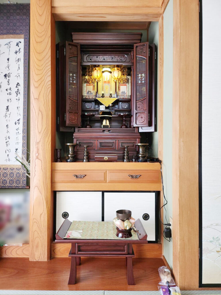 I様は前々から「仏壇を迎えるなら唐木が良い」とお考えだったようです。今回、ご主人様を供養されるために新しい唐木仏壇をお迎えされ、安堵されているご様子でした。これから、このお仏壇が心の拠り所となることと思います。この度はご縁をいただき、誠にありがとうございました。