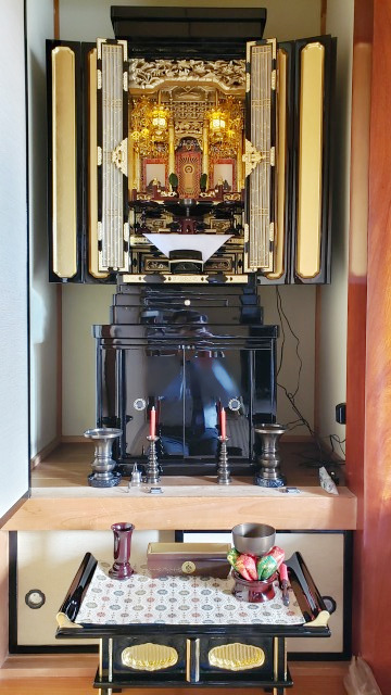 この度のお仏壇購入、ありがとうございました。ご主人を亡くされ「四十九日法要までに仏壇を迎えたい」と来店されました。他店様からカタログが届いている中で当店を選んでいただき嬉しく思います。仏壇台もピッタリと収まり大変喜んでいただけました。何かご相談事がありましたら気軽にご来店ください。お待ちしております。