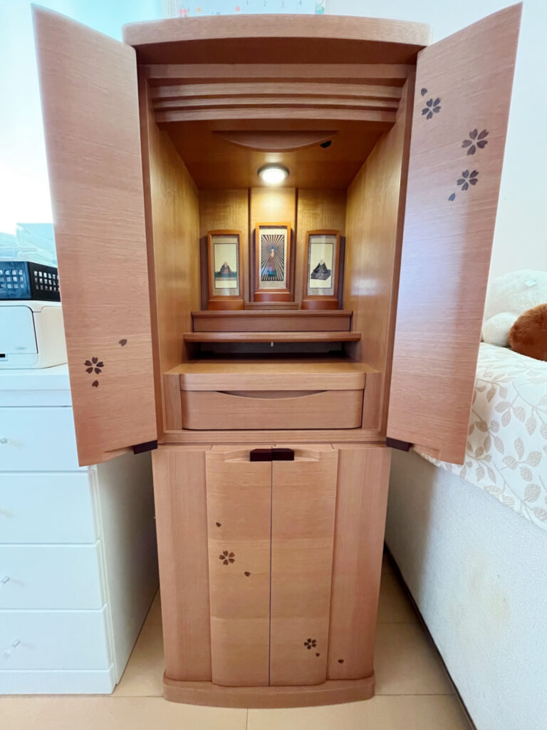 実家にお仏壇はあるのですが遠く持ってこれないので、新しく買いたいとご来店されました。床に置かれるとのことでしたので、下台付きのお仏壇をおすすめさせていただきました。花柄が素敵な家具調仏壇を気に入って下さりご契約いただきました。これから末永くご家族を見守ってくれることと思います。ご縁を頂きありがとうございました。