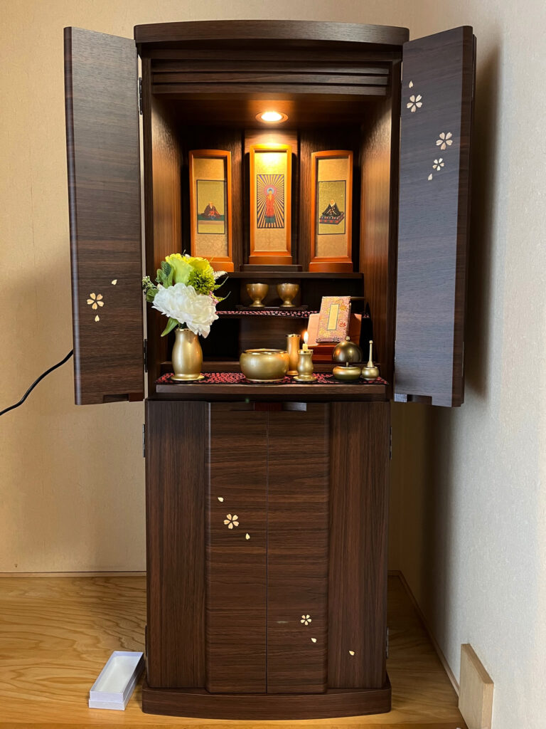 「仏間がないので」と、床の間に置けるお仏壇をお探しでした。店内のお仏壇をご覧になり、写真のお仏壇をお気に召されました。家具調仏壇をご契約いただけました。お仏壇をお迎えになり、ご先祖様もさぞお喜びのことと存じます。お手入れも簡単にできますので、末永く大切にお使いいただけることと存じます。ご縁を賜り、誠にありがとうございました。