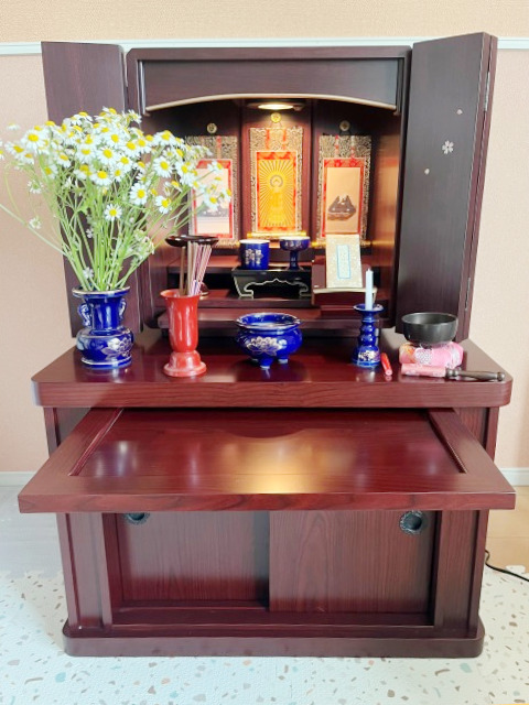 お子様のご逝去に際し、仏具を先にご購入いただいておりました。四十九日法要を迎えられるにあたり「お仏壇も用意したい」とご来店くださいました。ご家族で何度もご相談のうえ、家具調仏壇をご契約くださいました。ご供養のお手伝いをさせていただけたことに、心より感謝申し上げます。今後とも、お気軽にご相談いただけますと幸いです。