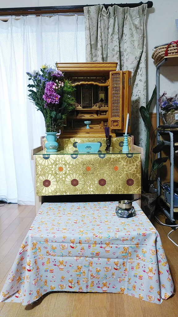 亡くなられたご主人様のお仏壇を、奥様・お父様・息子様のお三方で見に来ていただいたご縁です。仏間がないため、小型で四枚扉の仏壇をお選びいただきました。台は大工でいらっしゃるお父様が仏壇のサイズを測られ、ご主人様に手を合わせる目線の高さを考慮して準備してくださるとのことで、納品時にはお父様が立ち会ってくださいました。仏壇と台の相性が良く、喜んでいただけました。この度は、誠にありがとうございました。