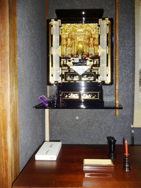 ご主人様がご逝去され、親子お二人でご来店いただきました。初めは家具調のお仏壇をご覧になっていましたが、お母様が金仏壇をご希望されると、息子様も「好きなものを選んでいい」とおっしゃり、ご購入いただくことになりました。お母様のご希望通り、飾り棚に納めさせていただきました。この度は誠にありがとうございました。