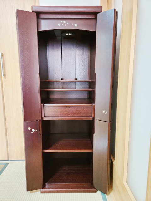 ご実家に大きなお仏壇があるものの、現在どなたも住んでおらず、買い替えをお考えとのことでご来店されました。家具調仏壇をご案内いたしました。お姉様にも写真をご覧いただいたところ、気に入っていただけました。このたびのご縁に、心より感謝申し上げます。