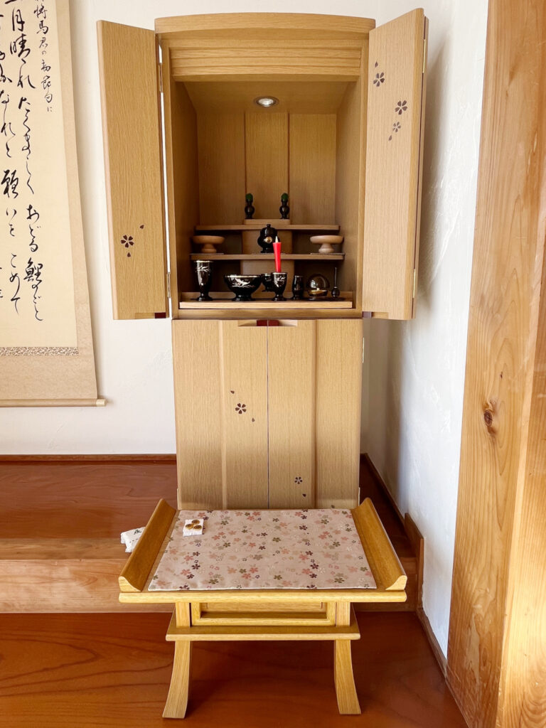 最初は古いお仏壇の修復をご希望されておりましたが、お見積もりの結果、新しいお仏壇に買い替えられることとなりました。床の間に設置されるとのことで、下台付きで高さのあるお仏壇をお選びいただきました。お道具も新たに買い揃えられ、ご先祖様もさぞお喜びのことと思います。この度は素晴らしいご縁をいただき、誠にありがとうございました。