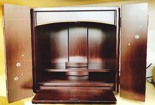 息子様が供養のためのお仏壇をとお考えになり、ご夫婦とお母様の3人でご来店いただきました。落ち着いた雰囲気と螺鈿の細工を気に入られ、家具調仏壇をご購入くださいました。「手を合わせる場所ができた」とお喜びいただき、ご自分たちでお持ち帰りになられました。このたびのご縁に心より感謝申し上げます。今後もお手伝いできることがございましたら、どうぞお気軽にお問い合わせください。