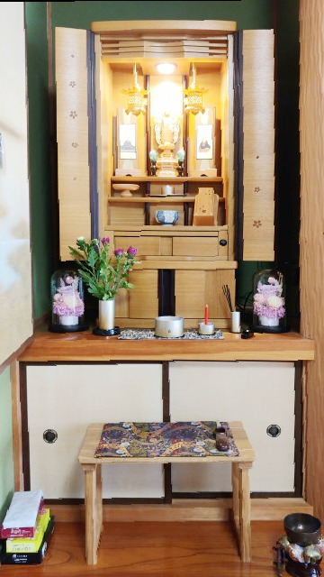 ご主人様の忌明けまでにお仏壇を準備されたいとのことで、ご家族で来店されました。お嬢様方は金仏壇をご希望される一方、Y様は家具調仏壇をお考えで、意見が分かれる場面もありましたが、最終的にはY様のご意見を優先され、家具調仏壇をご契約いただきました。「母の方が自分たちよりイマドキなのかも!?」とお嬢様方も和やかにお話しされ、楽しそうでご満足いただけたご様子が印象的でした。このたびは誠にありがとうございました。