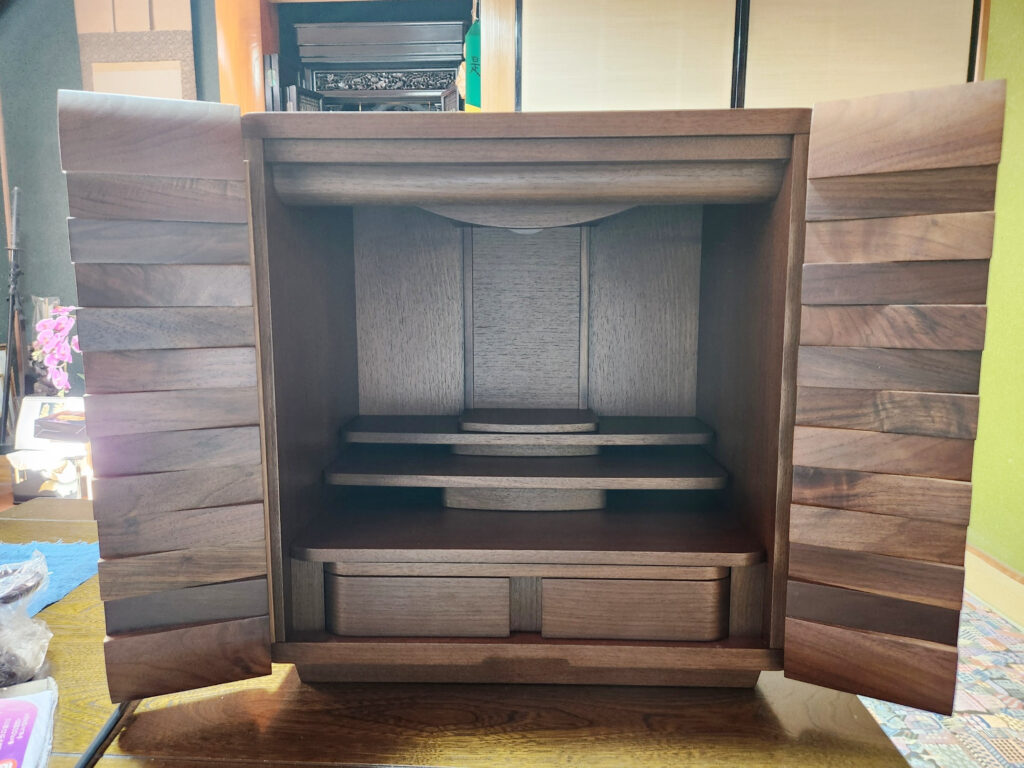 奥様がお仏壇の買い替えをご希望され、ご来店いただきました。現在のお仏壇に安置されているご本尊様の仏像の大きさに合う小型仏壇をお探しとのことでした。仏像のサイズをお伺いした上で、少しでも良いものをご提案したいと考え、天然木材を使用した家具調仏壇をご案内させていただきましたところ、大変お気に召していただけました。このたびのご縁に心より感謝申し上げます。