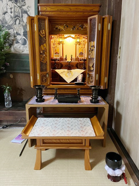 ご家族皆様でご来店くださいました。誠にありがとうございました。古いお仏壇から新しいものに買い替えをご検討とのことでした。いくつか迷われておりましたが、最終的に写真のお仏壇をご契約いただきました。床の間に設置されるとのことでしたので、コの字台もおすすめさせていただきました。このご縁に心より感謝申し上げます。