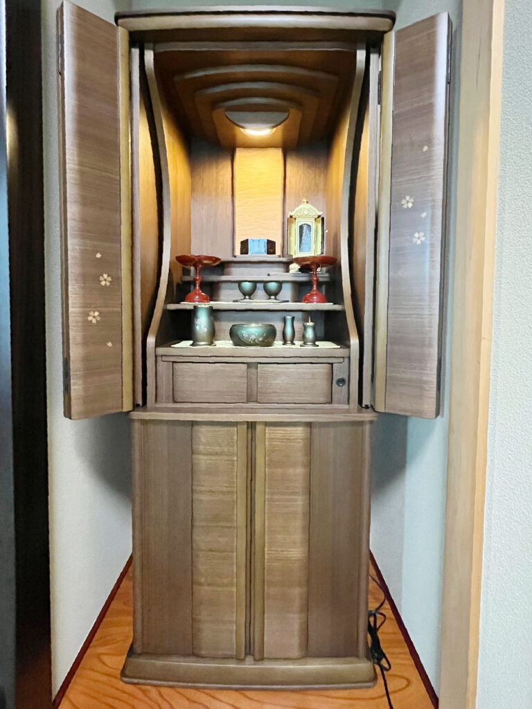 仏間に高さがあるため、下台付きのお仏壇にされるか、上置きのお仏壇に下台を作られるかで迷われていらっしゃいました。そのため、何基かお持ち込みさせていただきました。実際に置いて、高さや色味をご確認いただいた結果、写真のお仏壇にお決めになりました。ご納得いただけたご様子で何よりです。このたびはご縁をいただき、誠にありがとうございました。