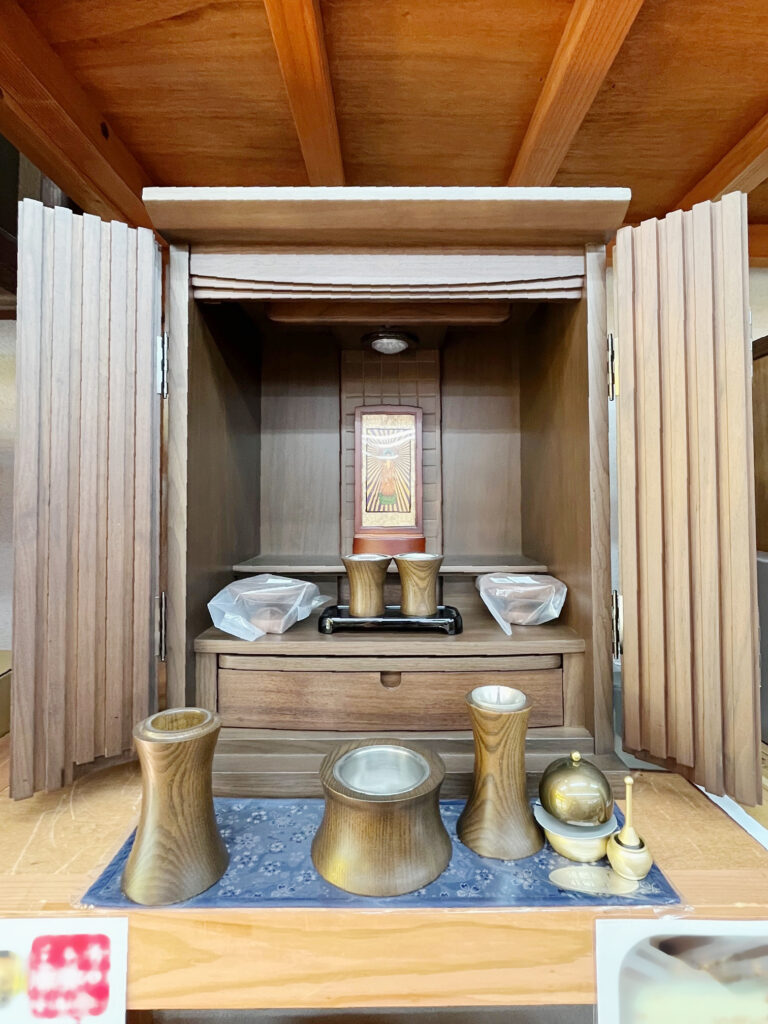 新しいお仏壇に買い替えたいとのことで来店されました。お子様とご相談されながら、お仏壇とお道具を選ばれました。小型のお仏壇ですので、お手入れもしやすく、ご負担も少ないかと思います。何かございましたら、どうぞいつでもご連絡ください。このたびは、誠にありがとうございます。