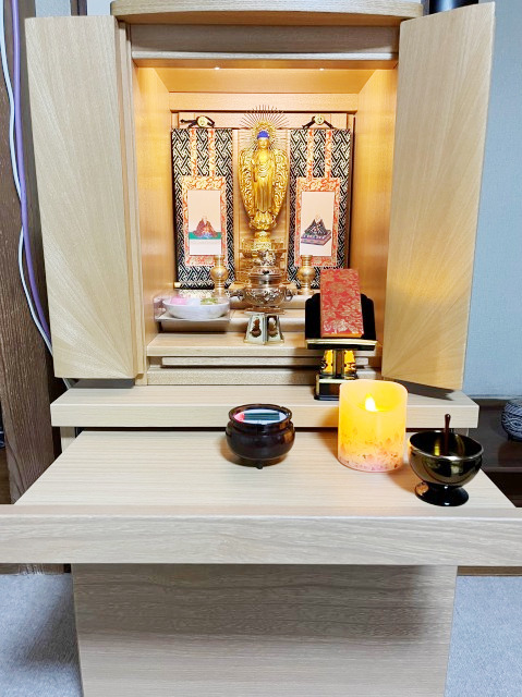 お引っ越しを機に小型仏壇への買い替えを検討されていました。仏具は事前に少しずづ買いそろえていらしたそうです。イメージ通りのお仏壇をご提案できましたこと嬉しく思います。今後とも末永いお付き合いを、よろしくお願いいたします。