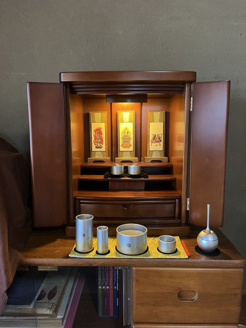 ご両親の先々のお引っ越しのことなどを考慮され、軽量な桐無垢のお仏壇を選ばれました。お父さまが長く愛用されている机に安置させていただきました。色・サイズともにピッタリでした。立ち会われたお母さま、叔母様もたいへんお喜びでした。