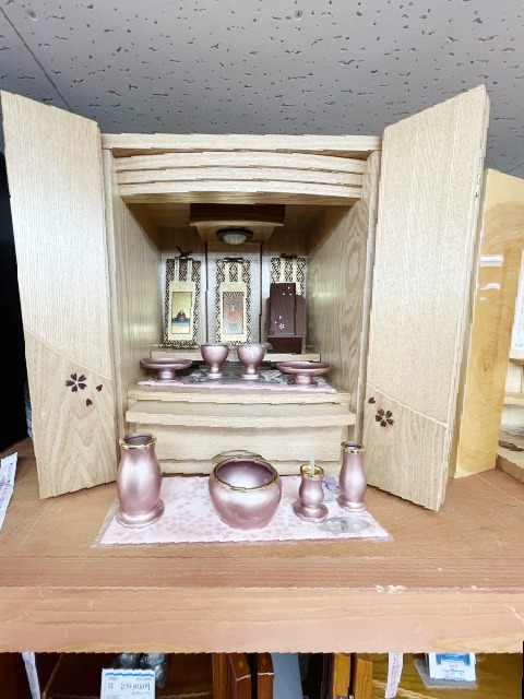 小型のお仏壇をお探しでした。店内をご覧になり桜の花びらの模様が素敵な家具調仏壇を気に入られました。お道具もピンクで揃えられました。毎日のお務めも楽しくできることと思います。これからも末永くご家族を見守ってくださることでしょう。ご縁をいただき、ありがとうございました。